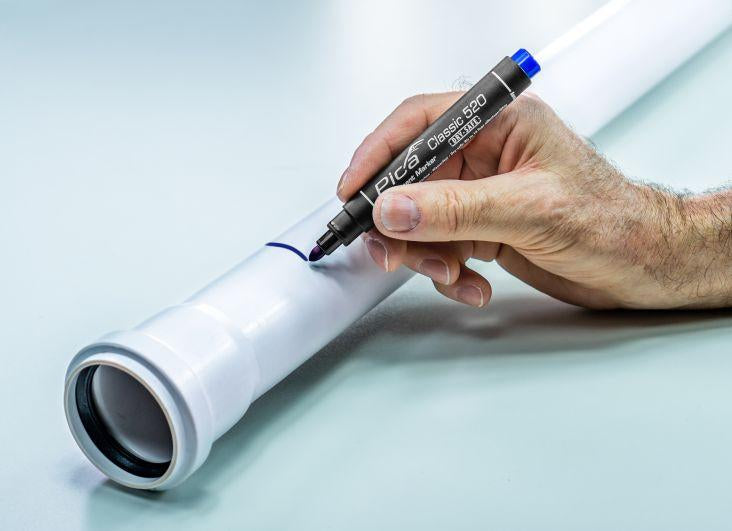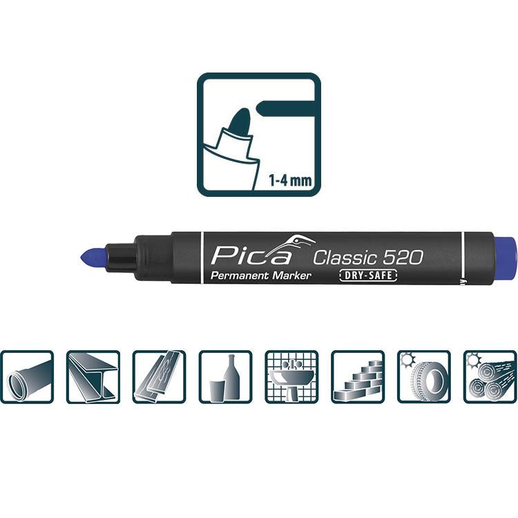 Pica Permanentmarker 1-4mm, Rundspitze, blau Pica Classic 520 Farbe: blau Permanentmarker, wasserfest, für dauerhafte Markierungen auf beinahe allen Oberflächen. Nach 10 Sekunden Abriebfest. "Austrocknungssicher": bis zu 14 Tage ohne Verschluss lagerfähig! Wasserfeste Permanent-Tinte auf Alkoholbasis. Frei von Xylol und Toluol. Mit Rundspitze in der Schreibstärke 1-4 mm