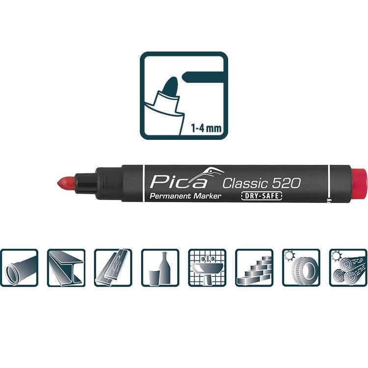 Pica Permanentmarker 1-4mm, Rundspitze, rot Pica Classic 520 Farbe: rot Permanentmarker, wasserfest, für dauerhafte Markierungen auf beinahe allen Oberflächen. Nach 10 Sekunden Abriebfest. "Austrocknungssicher": bis zu 14 Tage ohne Verschluss lagerfähig! Wasserfeste Permanent-Tinte auf Alkoholbasis. Frei von Xylol und Toluol. Mit Rundspitze in der Schreibstärke 1-4 mm