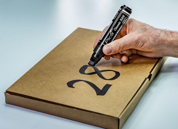 Pica Permanent-Marker XXL, 4-12mm, Keilspitze, schwarz Pica Classic 528 Farbe: schwarz Spitzenform: Keilspitze Schreibstärke: 4-12mm Der Pica Permanent-Marker XXL enthält Permanent-Tinte auf Alkoholbasis. Hält deutlich sichtbar auf nahezu jeder Obläche und ist bereits nach ca. 5 Sekunden sowohl wasserfest, als auch abriebfest. Für dauerhafte Beschriftungen bestens geeignet, da die Tinte schwer entfernbar ist. Frei von Xylol und Toluol.